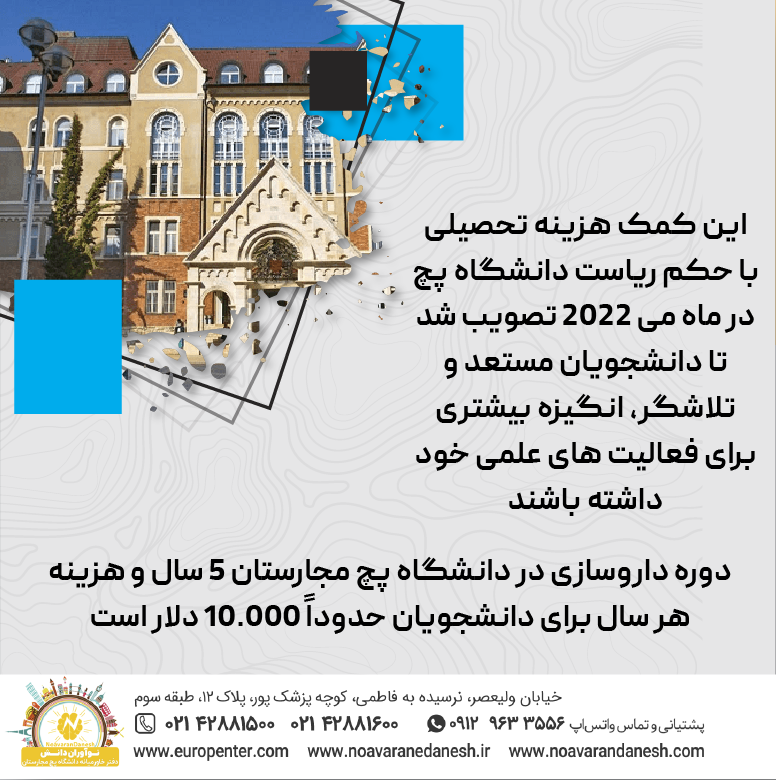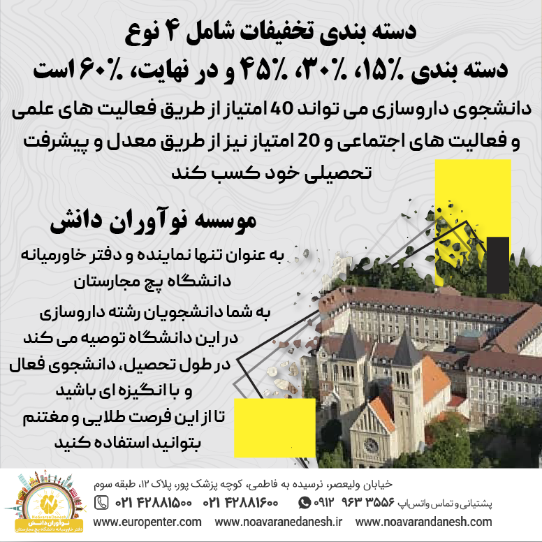 موسسه نوآوران دانش، به عنوان تنها نماینده و دفتر خاورمیانه دانشگاه پچ مجارستان به شما دانشجویان رشته داروسازی در این دانشگاه توصیه می کند در طول تحصیل، دانشجوی فعال و با انگیزه ای باشید تا از این فرصت طلایی بتوانید استفاده کنید.